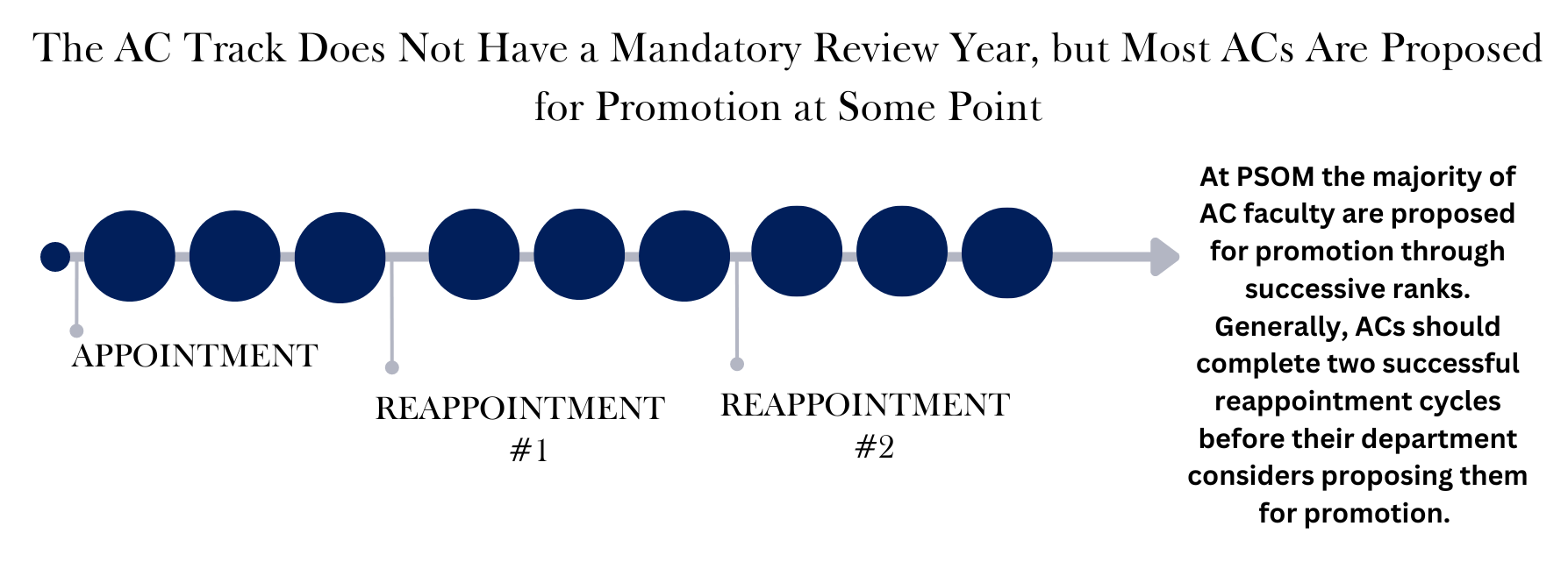 Time in rank at peer institution may be considered when assessing a candidate's trajectory and engagement. Candidates with at least two years in a faculty appointment prior to PSOM, could be considered concomitantly with the first reappointment. Such proposals will be rare and should be pre-reviewed by the PSOM COAP ACC chair prior to initiating a request for promotion in the department.